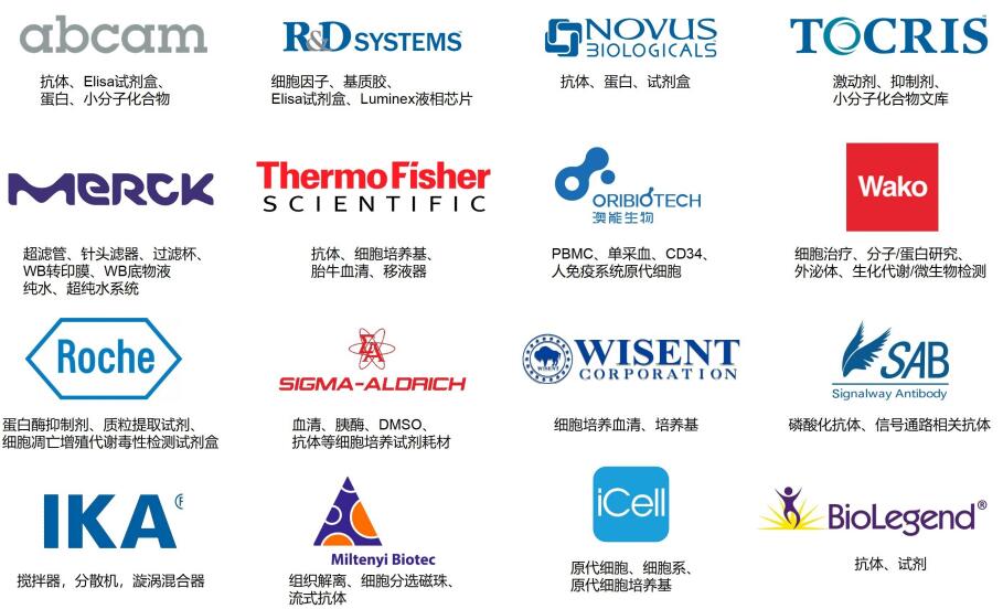在產(chǎn)品資源方面,我們是以下著名品牌的一級(jí)代理商:Abcam (抗體、蛋白、試劑盒、小分子化合物),R&D、Novus、Tocris (抗體、細(xì)胞因子、試劑盒、小分子化合物),MERCK (包括millipore、sigma和roche品牌,超純水、神經(jīng)生物學(xué)、表觀遺傳研究試劑、WB試劑耗材、超濾過濾耗材、細(xì)胞培養(yǎng)試劑、胎牛血清等),Thermo Fisher(抗體、細(xì)胞培養(yǎng)基、胎牛血清、移液器),Miltenyi Biotec (流式抗體、磁珠等) ,Wako (分子生物學(xué)、細(xì)胞培養(yǎng)、蛋白分析、神經(jīng)生物學(xué)、外泌體、基質(zhì)膠等),SAB(磷酸化蛋白抗體、試劑盒等),澳能生物 (細(xì)胞、培養(yǎng)基、血清),維森特(細(xì)胞培養(yǎng)相關(guān)產(chǎn)品、血清),Takara(PCR/qPCR、基因克隆、基因功能研究),IKA(攪拌器,分散機(jī),漩渦混合器)等等。